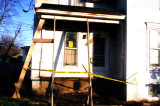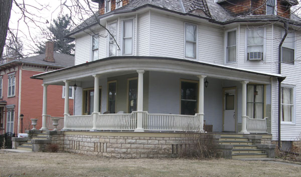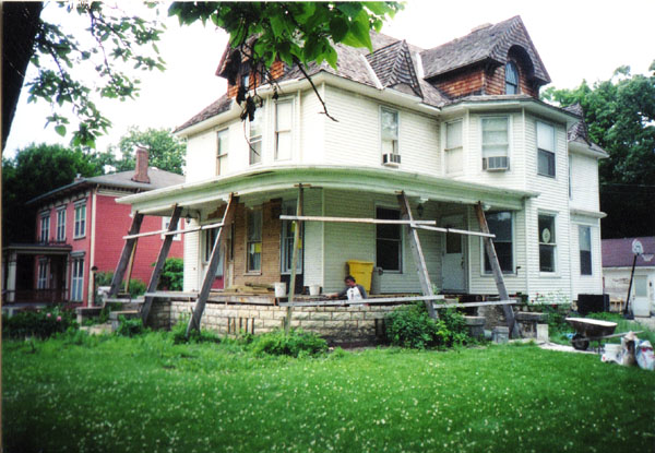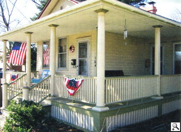 A 'before' photo of our Plum St. porch restoration project shows the inappropriate porch columns and balustrade on this circa 1880 house.