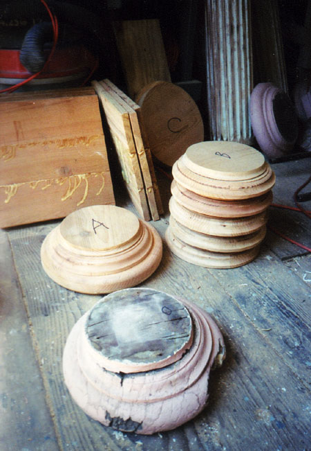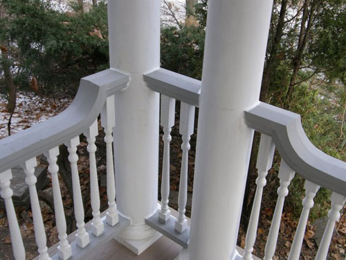 The original circa 1890 columns were stripped of multiple layers of paint. The rotted column bases were replaced with new wood sections and all other areas of deterioration on the original columns were repaired using epoxy.