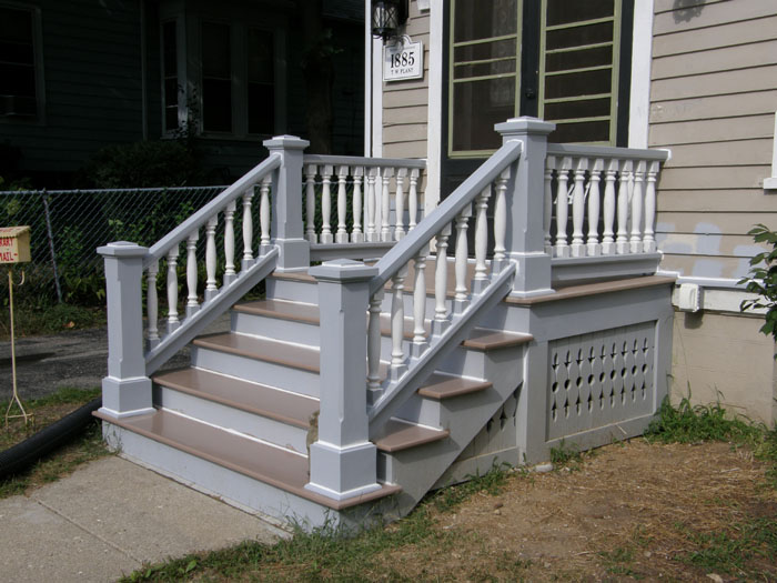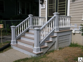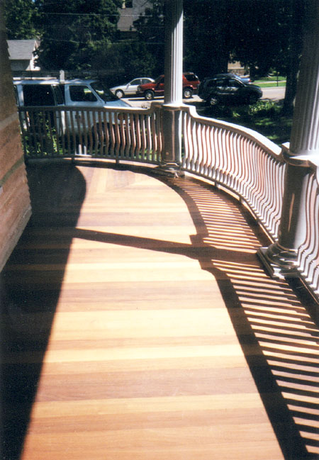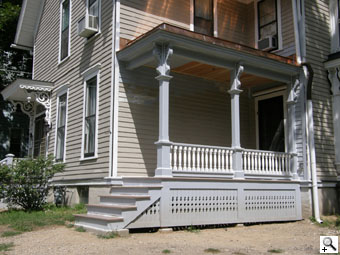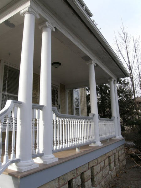 The completed Plum St. porch is much more appropriate and appealing. Columns, railings, skirting, flooring, stairs, and newel posts were replaced to give this circa 1880 house the charm it deserves.