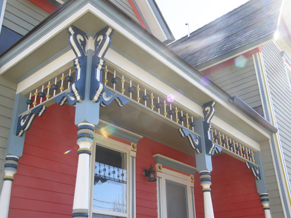 New custom-made porch column brackets and a "ball and stick" frieze were installed. With a little detective work, and careful demolition, we were able to find good "ghost images" of the original brackets and frieze left behind in the old paint lines. That, along with surviving historic photos, gave us our design for the elements of this porch.