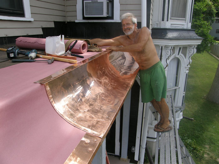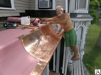 A new copper roof is installed over our framing by a metal roofing subcontractor.
